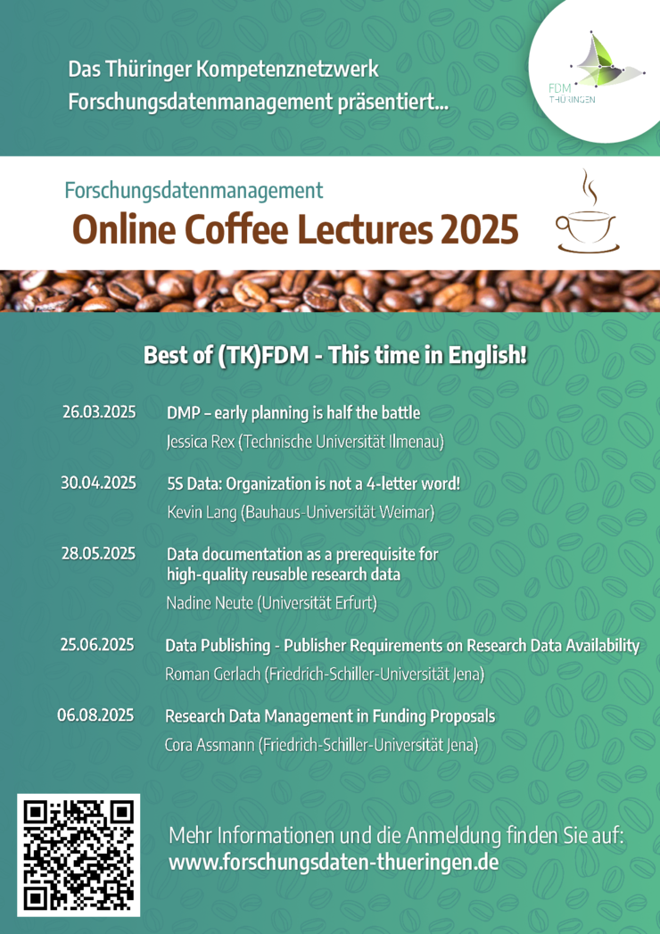Das Thüringer Kompetenznetzwerk Forschungsdatenmanagement präsentiert im Oktober 2025 die neue Serie unserer beliebten Coffee Lecture Reihe! Jeden Monat findet am Mittwoch online über Zoom eine Veranstaltung statt.