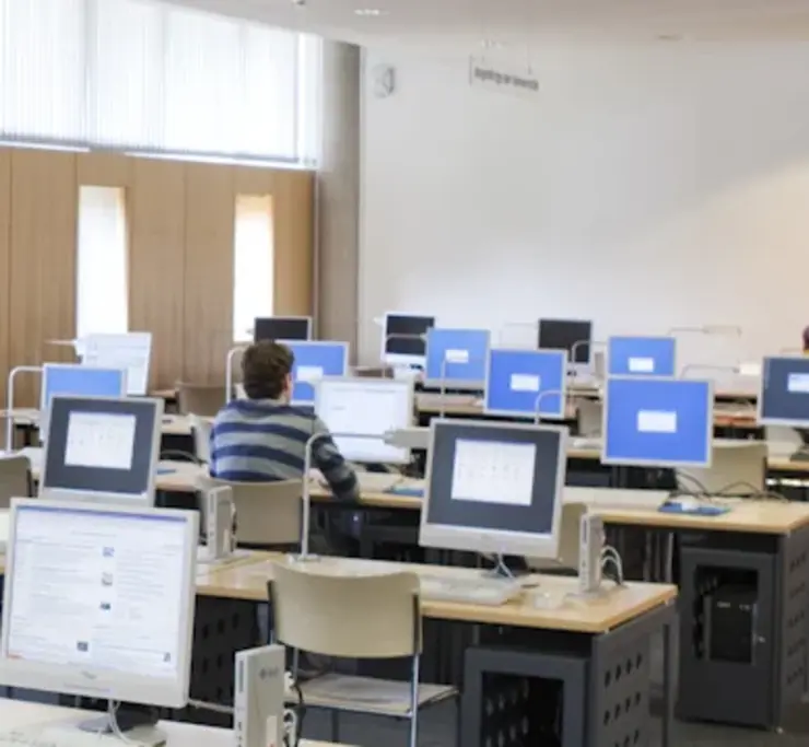 Im PC-Raum im EG stehen hochwertig ausgestattete PCs für DVD-, CD-ROM- und multimediale Internetanwendungen zur Verfügung. Diese sind für Angehörige der Universität mit persönlichem Login zugänglich.