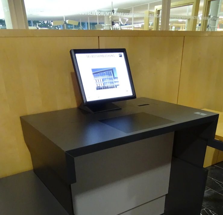 Zur selbstständigen Ausleihe von Büchern während der gesamten Öffnungszeit der Bibliothek gibt es die Selbstverbuchungsanlagen im Erdgeschoss und im 2. OG.