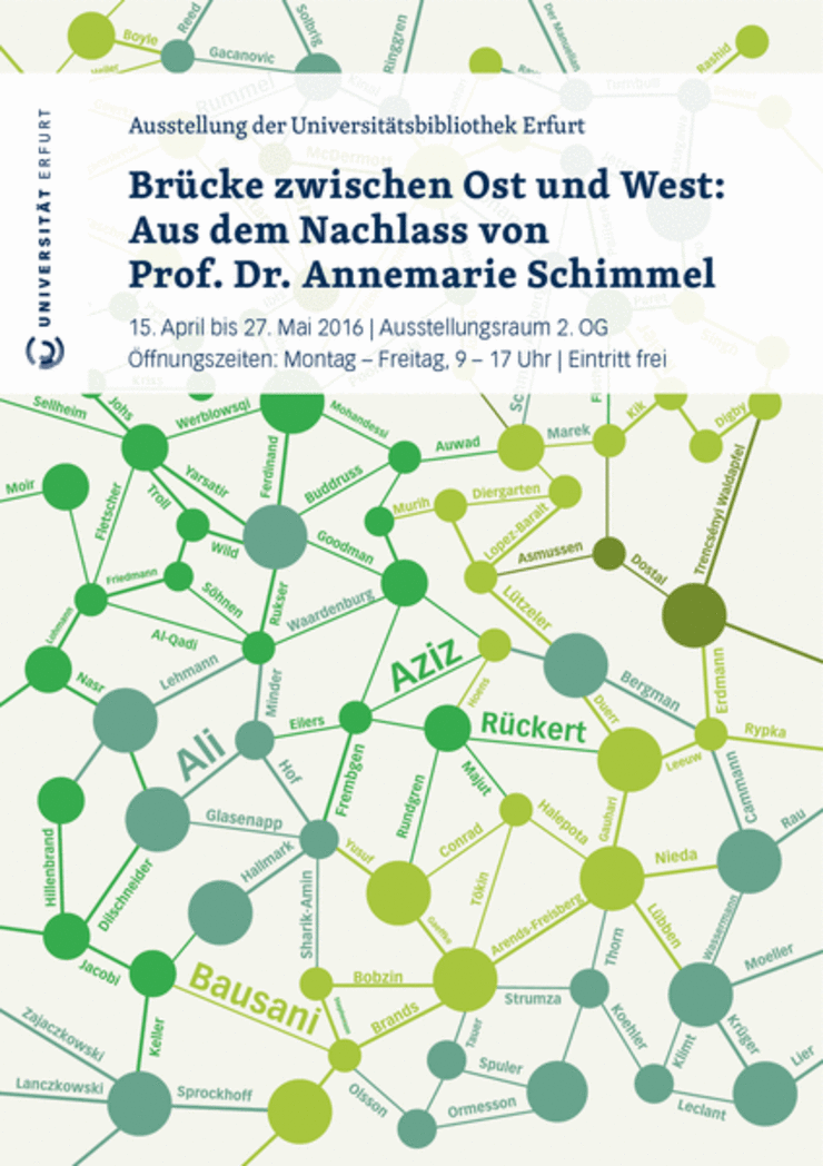 Annemarie Schimmel wurde am 7. April 1922 in Erfurt geboren und starb am 26. Januar 2003 in Bonn. In Erinnerung an ihren Geburtstag und in Verbindung mit dem Internationalen Workshop: „Sufism East and West. Mystical Islam and Cross-cultural Exchange between the West and the Muslim World“, der vom 15. – 17. April 2016 an der Universität Erfurt stattfindet, gibt die Universitätsbibliothek Erfurt in einer Präsentation von mehr als 100 Objekten (Bücher, Briefe, Manuskripte und Korrekturfahnen, Orden etc.) einen Einblick in den von ihr aufbewahrten Teilnachlass und damit in das Leben dieser bedeutenden Wissenschaftlerin.