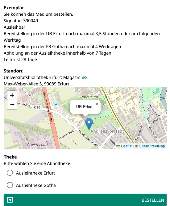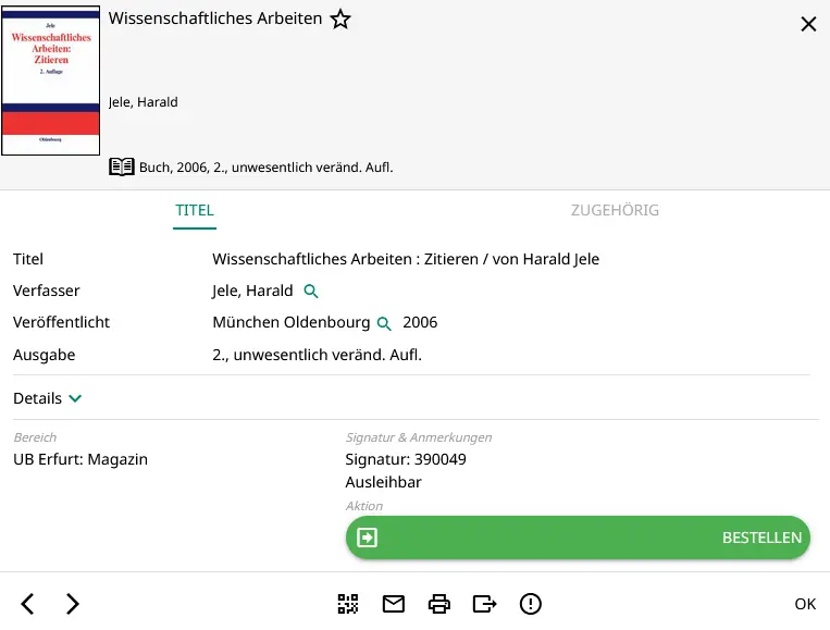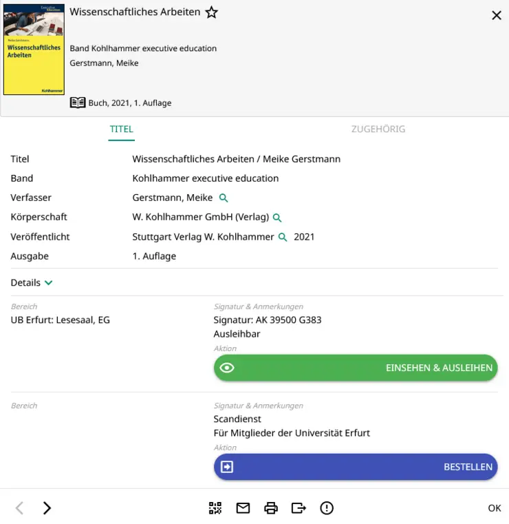Informationen zum Exemplar in der Bibliothek sind unter dem Bereich “Details” zu sehen: