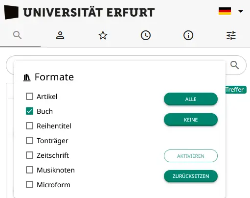 Der Button “Zurücksetzen” macht die Auswahl rückgängig, die Suche wird ohne Filterung wiederholt.