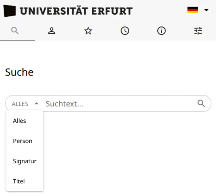 Sie können Ihre Suche auf bestimmte Felder eingrenzen. Zur Auswahl stehen: Alles, Person, Signatur und Titel. Voreingestellt ist die Suche über alle Wörter (Alles). Gesucht wird dabei gleichzeitig in allen Feldern der Titelbeschreibung (Person, Titelstichwort, Schlagwort etc.). Groß- und Kleinschreibung ist bei der Eingabe nicht relevant.