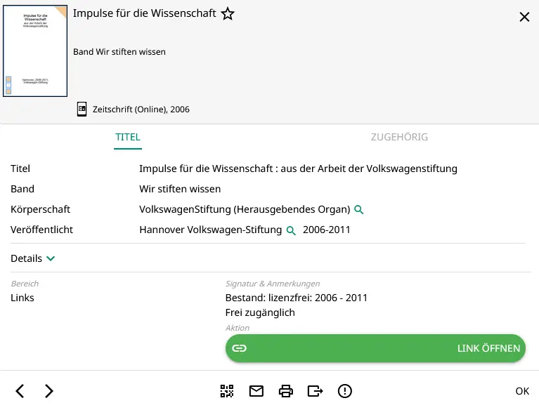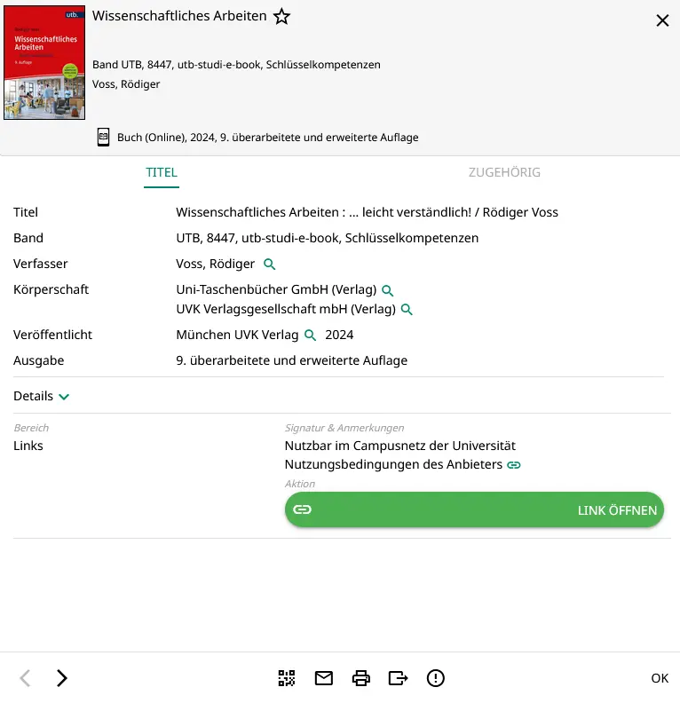 Der Reiter "Titel" zeigt alle verfügbaren bibliografischen Informationen zur jeweiligen Publikation.