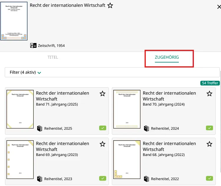 Unter dem Reiter "Zugehörig" können sie zugehörige Publikationen wie Zeitschriftenbände, Aufsätze oder Teile einer Schriftenreihe finden.