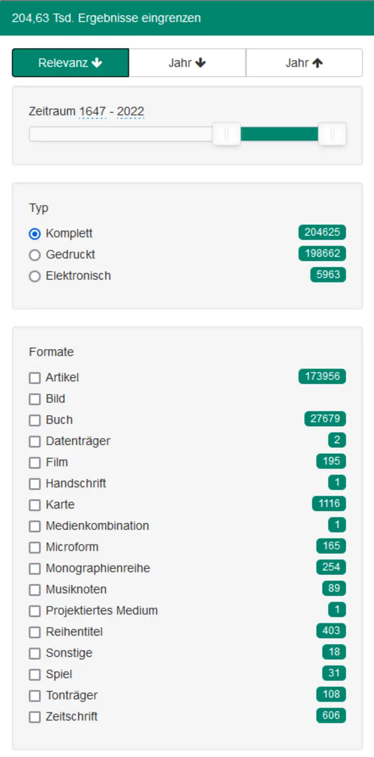 Bei der Rubrik "Format" (z.B. Buch, Aufsatz, Musiknoten, Film) können mehrere Häkchen gesetzt werden.