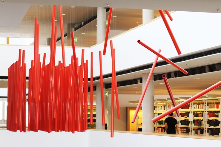 Die roten Rohre, die in der Luft zu schweben scheinen, sind ein Blickfang in der Bibliothek. Sie sind das Werk des Künstlers Dietrich Förster, der sich seit 1990 schwerpunktmäßig der Kunst im öffentlichen Raum mit Skulpturen und Installationen widmet.
