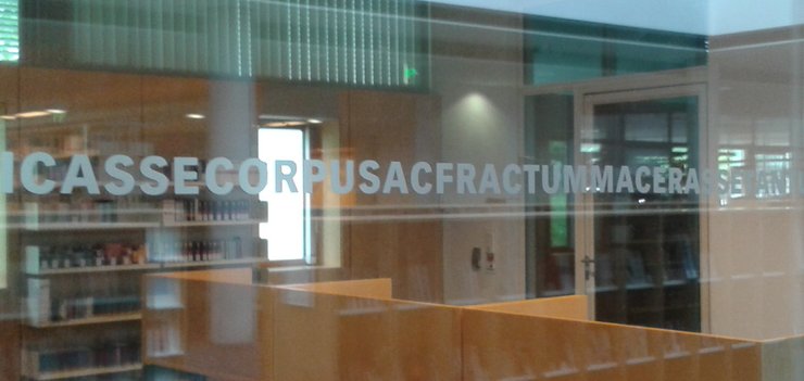 Bei der "endlosen" Inschrift an den Glaswänden in der Bibliothek handelt es sich rein formal um einen sogenannten Durchlaufschutz. Ein kreativer Bibliothekar hatte die Idee, dieses notwendige Sicherheitselement in ein "Spruchband" zu verwandeln, das zu denken gibt. Es sind lateinische Verse von Notker Balbulus aus dem 9. Jahrhundert: