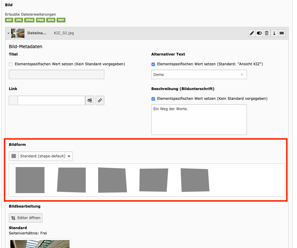 Wählt man im gezeigtem Bereich eine Form aus und speichert diese, wird das Bild im Frontend automatisch die gewählte Form besitzen. Dies bietet dem Redakteur einen gewissen Gestaltungsfreiraum.