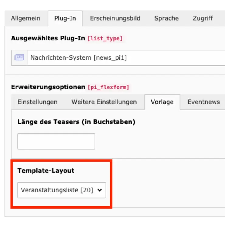 Als Redakteur hat man die Möglichkeit, News im Plugin als "Teaser-Liste" zu definieren. Hierzu findet man im News-Listenplugin unter dem Reiter "Vorlage" die Auswahlmöglichkeit des Templates. Hier steht die "Teaser-Liste" zur Verfügung.