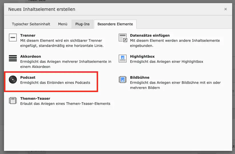 also <script [...] data-configuration="DIESEN TEIL KOPIEREN"></script> - Im TYPO3 über "Besondere Elemente" ein Podcast-Element einfügen