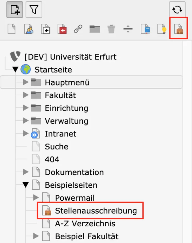 Speziell für die Darstellung von Stellenausschreibungen wurde ein eigener Seitentyp "Stellenausschreibung" angelegt. Dieser steht, wie die Standardseite auch, per Drag & Drop im Seitenbaum zur Verfügung. Zur besseren Unterscheidung wurde ein eigenes Icon dafür verwendet.