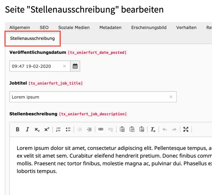 Nur für diesen Seitentyp gibt es in den Seiteneigenschaften einen neuen Reiter "Stellenausschreibung". Innerhalb dieses Reiters können alle für eine Stellenausschreibung relevanten Daten gepflegt werden. Diese Daten werden im entsprechend dem Template im Frontend ausgegeben.