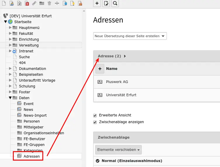 Die Felder "Einsatzort" und "Postanschrift" werden aus tt-address-Datensätzen gespeist. Diese Adress-Datensätze werden zentral im Ordner "Daten > Adressen" gepflegt.
