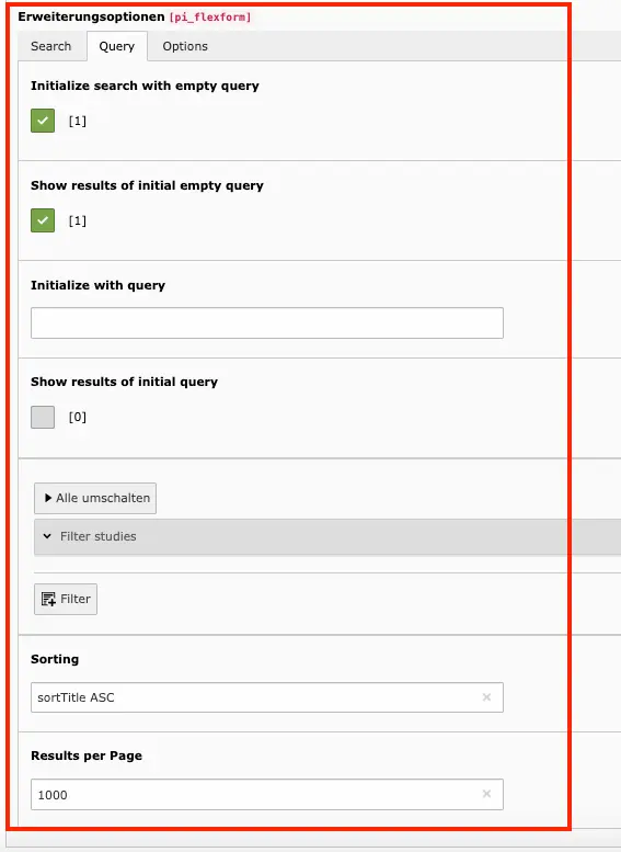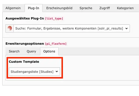 Um die Suchergebnisliste für die Studiengänge optisch und technisch passend ausgeben zu lassen, muss man als Redakteur im Solr Suchplugin folgende Einstellungen vornehmen.