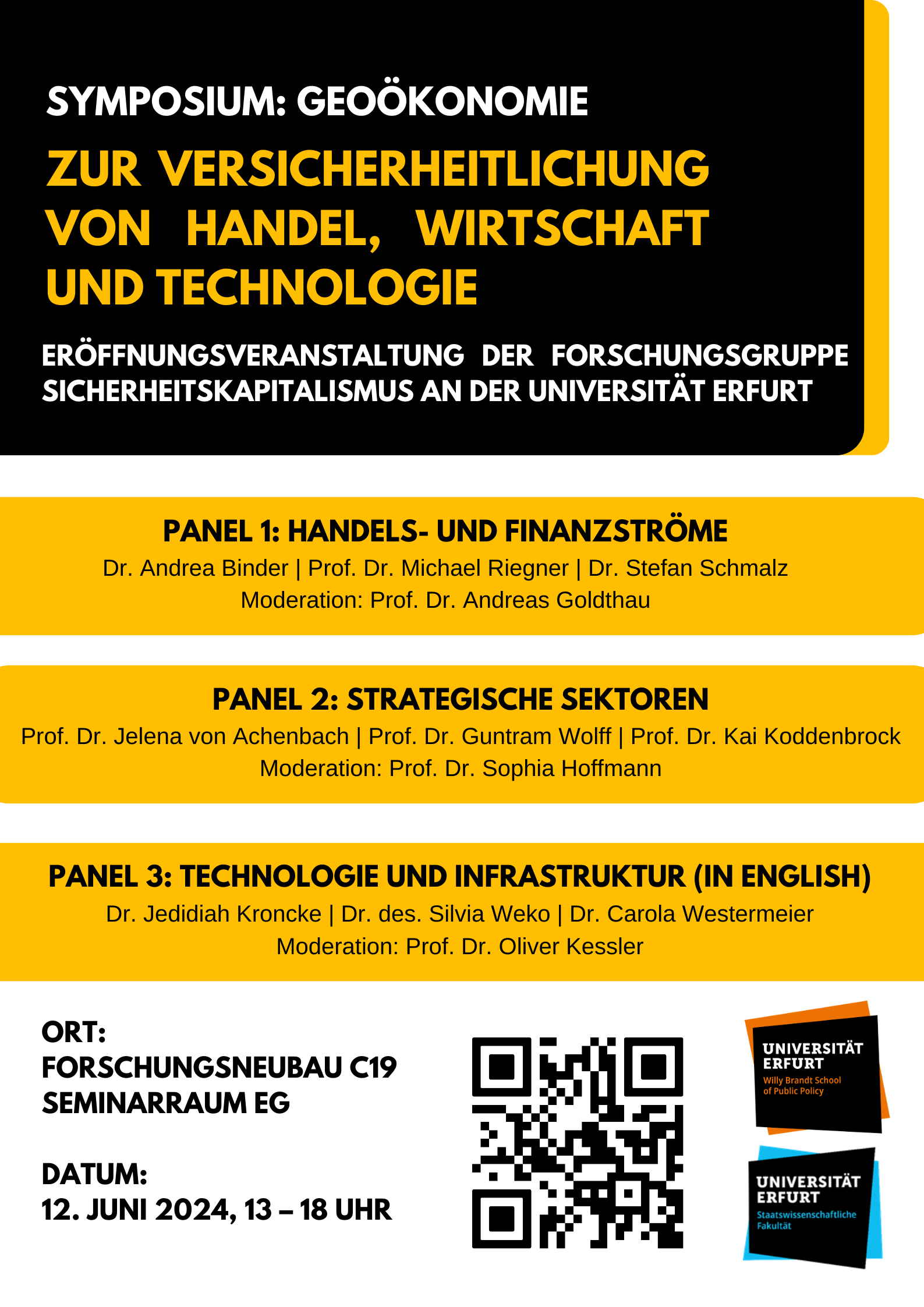 Geo-economics has become subject to conversations across academic disciplines. The symposium aims to explore interdisciplinary approaches on the topic from law, political economy, and international relations, and put them into a conversation. It also seeks to showcase existing strands of research at the University of Erfurt. The symposium is the opening event of the newly established research group on Security and Capitalism, supported by the University of Erfurt, and is open to all interested members of the university community. Special attention will be given to involving early career researchers and their projects.