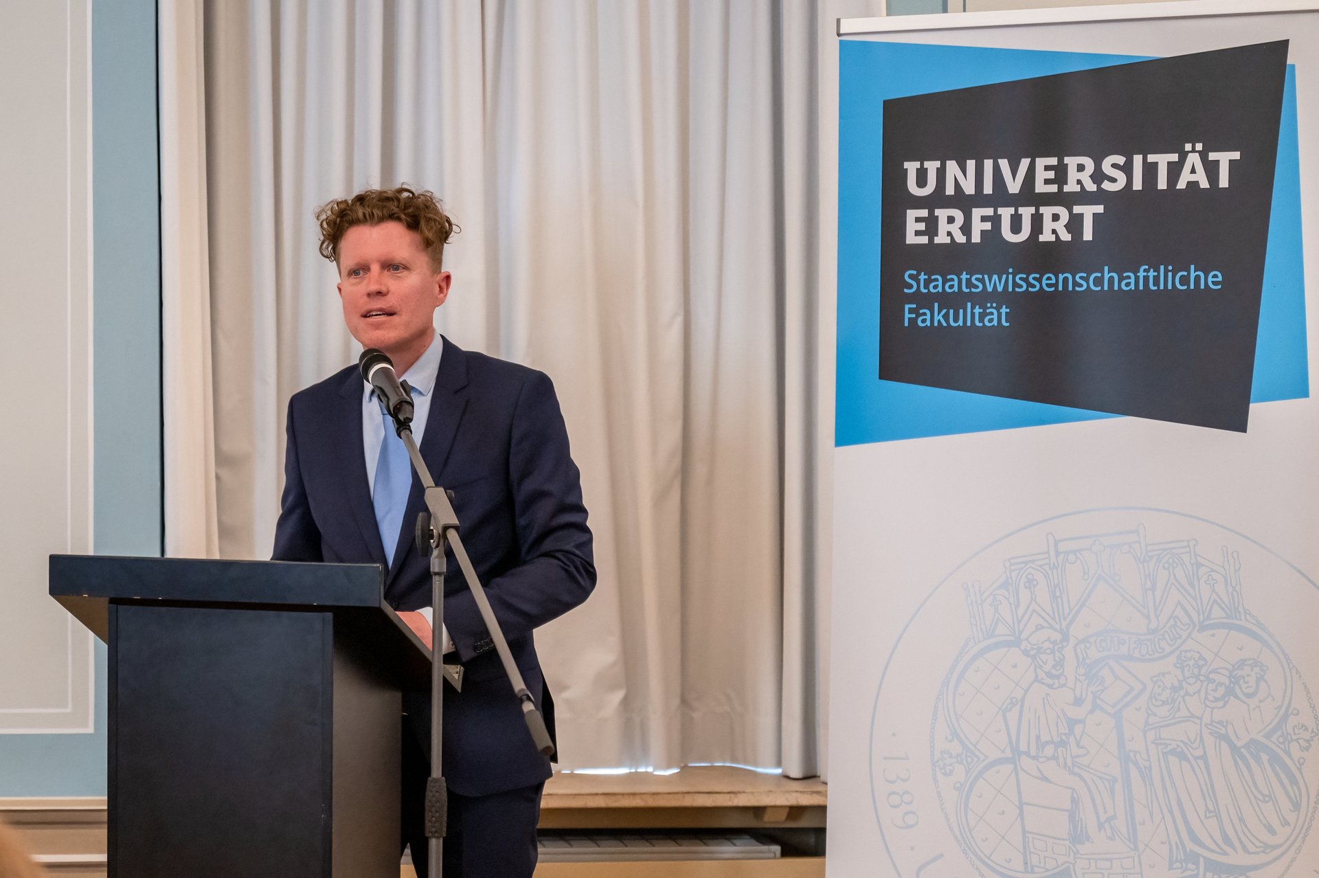 The event ‘Just transitions: How can socio-economic inequalities of climate change be addressed?’ took place in Haus Dacheröden in the heart of Erfurt on May 23, 2022, and was co-hosted by the Faculty of Law, Economics, and Social Sciences, represented by its Dean, Prof. Till Talaulicar. In her keynote address, MP Katrin Göring-Eckardt, Vice President of the German Bundestag made an impassioned plea not only to confront the climate crisis, but also to confront existing inequalities. ‘The climate crisis makes poor people poorer, not only in Germany but also in the Global South. That is why we are fighting against existing inequalities with a socially just climate politics,’ she said.