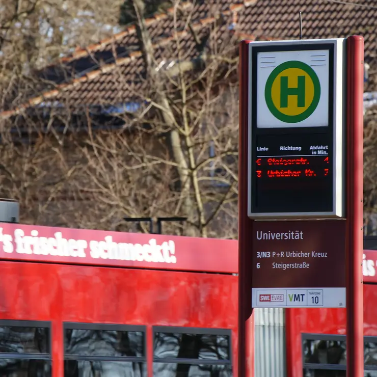 To get from the train station to the university, take the lines 3 (direction Europaplatz) and 6 (direction Rieth). The main entrance of the university is directly opposite the "Universität" stop.