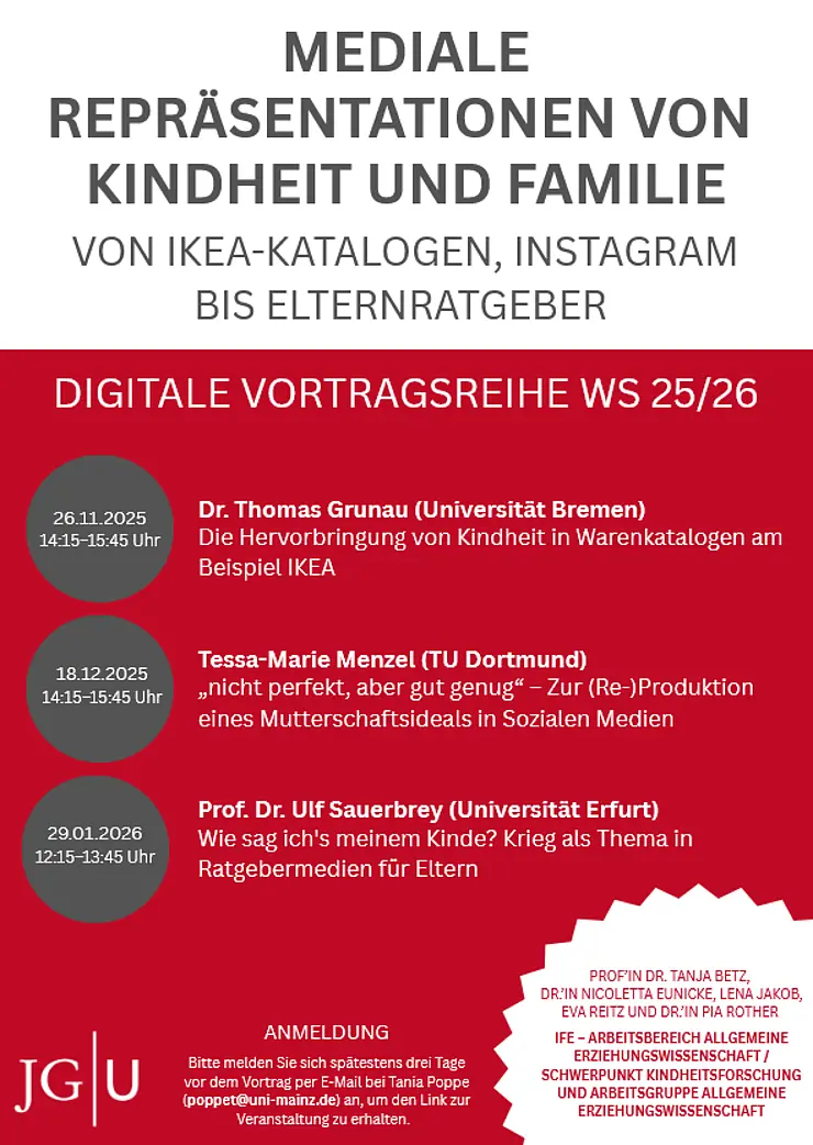 Prof. Dr. Ulf Sauerbrey hält am 29.01.2026 einen Vortrag mit dem Titel “Wie sag ich's meinem Kinde? Krieg als Thema in Ratgebermedien für Eltern” im Rahmen der digitalen Vorlesungsreihe "Mediale Repräsentationen von Kindheit und Familie. Von IKEA-Katalogen, Instagram bis Elternratgeber" der AG Allgemeine Erziehungswissenschaft an der Johannes Gutenberg-Universität Mainz. Interessierte können Sie sich hierzu bis drei Tage vor dem Vortrag per Mail über das Sekretariat von Univ. Prof.‘in Dr. Tanja Betz (Frau Tania Poppe, poppet@uni-mainz.de) anmelden.