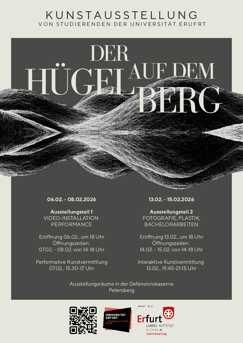 Kunststudierende der Universität Erfurt stellen aus in den Ausstellungsräumen der Defensionskaserne auf dem Petersberg: Sie geben Einblick in ihre künstlerischen Prozesse mit Video-Installation, Performance, Fotografie und Plastik/Objekt, Bachelor-Absolvent:innen präsentieren ihre Abschlussprojekte.