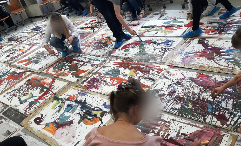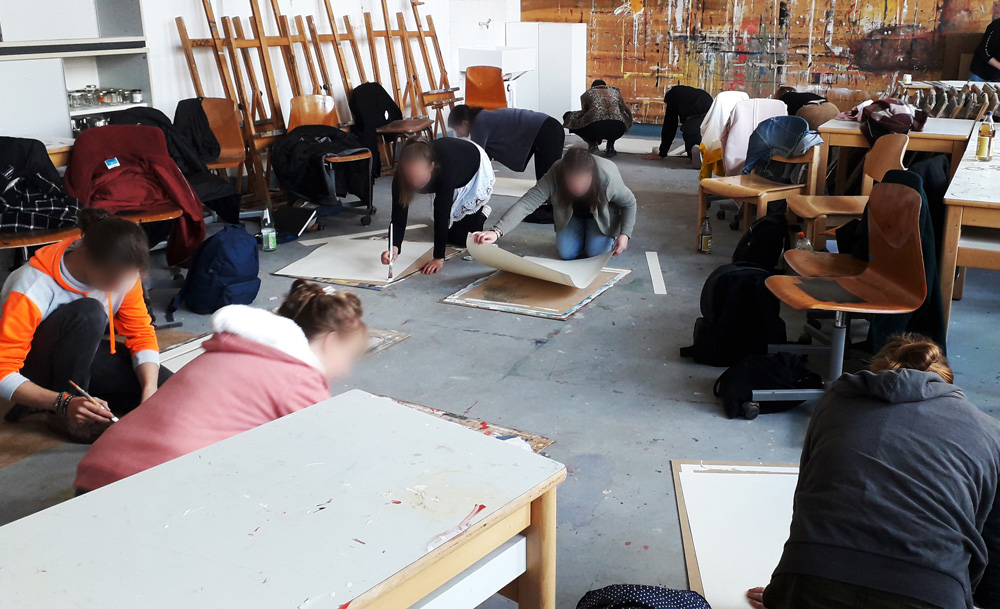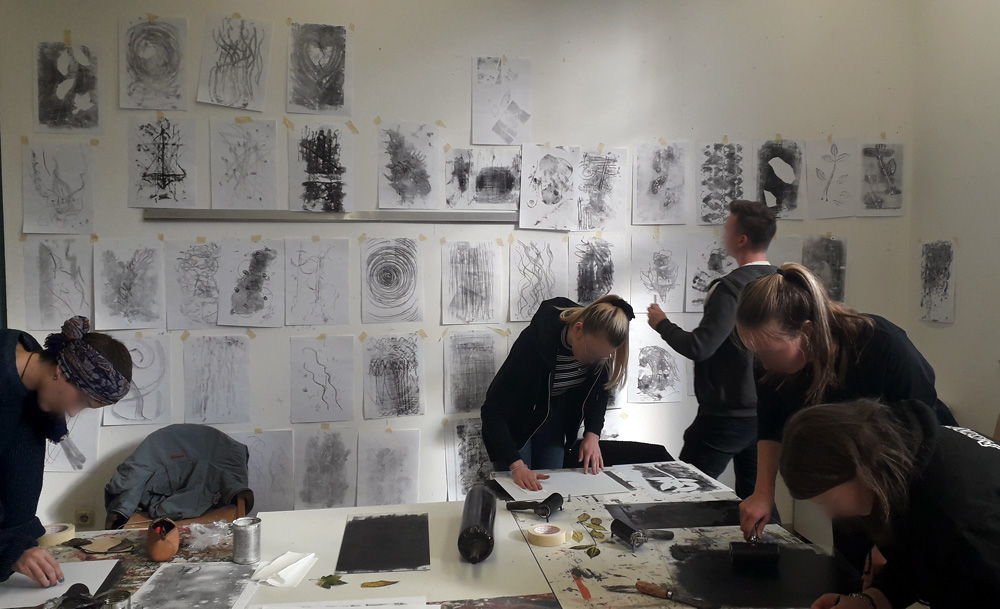 - Die Studierenden arbeiten hauptsächlich mit den Möglichkeiten des Hoch-, Tief- und Siebdrucks.