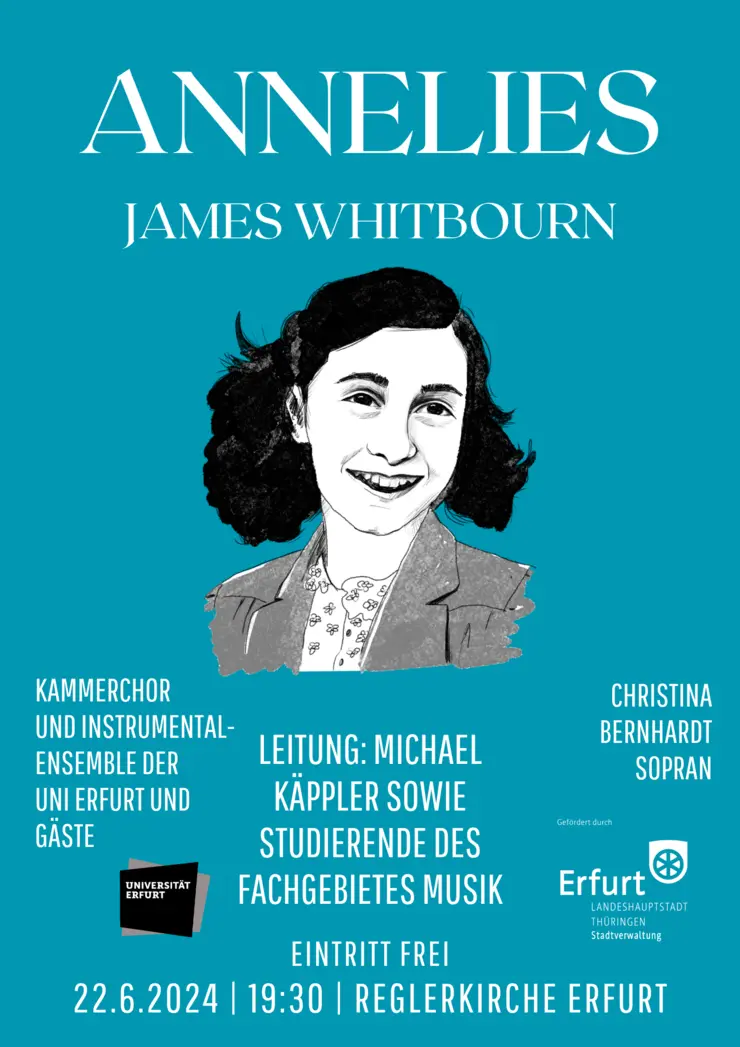 Im Oratorium „Annelies“ verbindet James Whitbourn zeitgenössische Chormusik mit spätromantischen Elementen und mit der Klezmer- Tradition. Dabei verwendet der britische Komponist Rückgriffe auf traditionell jiddische Musik ebenso wie Zitate von Filmmusik und „klassischer“ Musik. Das Werk erzählt die Schlüsselstellen der Tagebücher von Anne Frank: Vom Plan, sich zu verstecken über die letzte Nacht zu Hause und die Beschreibung des Lebens im Versteck, den Ängsten bei Luftangriffen der Alliierten, die dennoch immer mit der Hoffnung auf die nahende Befreiung verbunden waren, bis hin zum Verrat und der Verschleppung zum Sammellager Westerbork. Als Schlusspunkt nach dem tragischen Ende durch Gefangennahme und den Tod im Konzentrationslager Bergen-Belsen setzt Whitbourn zwei Textstellen aus dem Tagebuch vom Februar und Juli 1944 unter dem Titel „Anne‘s meditation“, die so schließen: