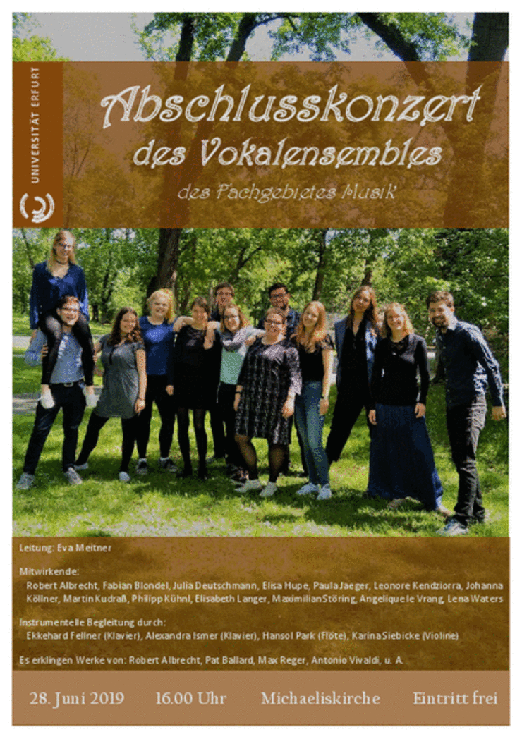 Am Fachgebiet Musik der Universität Erfurt erhalten Studierende der Studienrichtungen Musikerziehung und Musikvermittlung eine vielseitige künstlerische und wissenschaftliche Ausbildung. Einen wesentlichen Bestandteil bildet dabei der Chor- und Ensembleleitungsunterricht, in dessen Rahmen jährlich ein umfangreiches künstlerisches Fachgebietsprojekt verwirklicht wird.