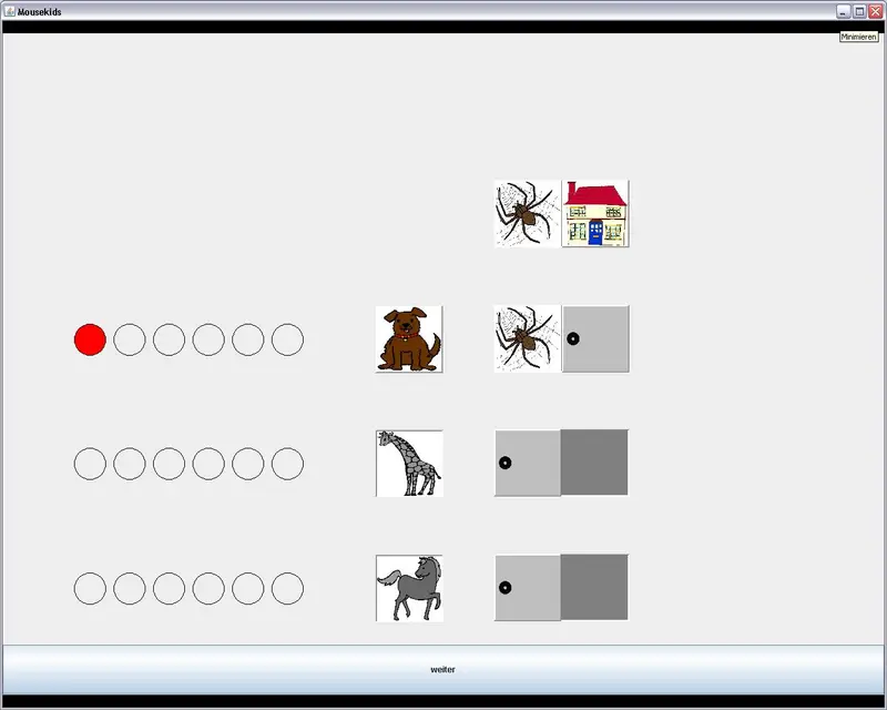 Mousekids is an easily adaptable tool for examining decision making behavior in children and adults. It was designed analogue to the classic “mouselab” paradigm (Payne, Bettman & Johnson, 1988). In contrast to mouselab tools typically used with adults, the Mousekids program contains two different phases: In the learning phase, participants learn the validity of each cue, one after the other; in the subsequent testing phase, participants then make a series of decisions. The cue validities are symbolized throughout the entire game using so-called “smart circles”. Due to the experience-based learning of the cue validities as well as their simple depiction based on absolute frequencies, the Mousekids tool can be used to examine probabilistic inference-based decisions in children even as early as preschool.
