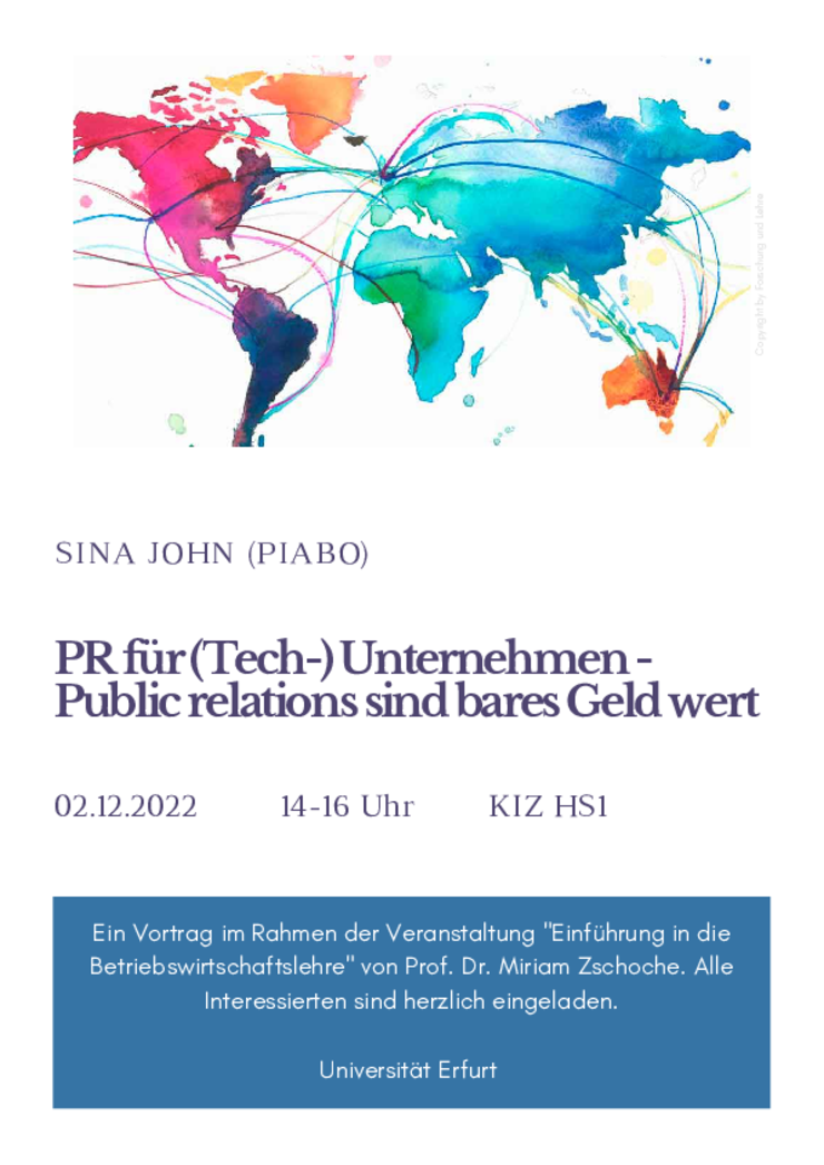 02.12.2022, Guest lecture in the context of the lectures "BWL I und II", topic "PR für (Tech-) Unternehmen - Public relations sind bares Geld wert", Sina John (PIABO PR)