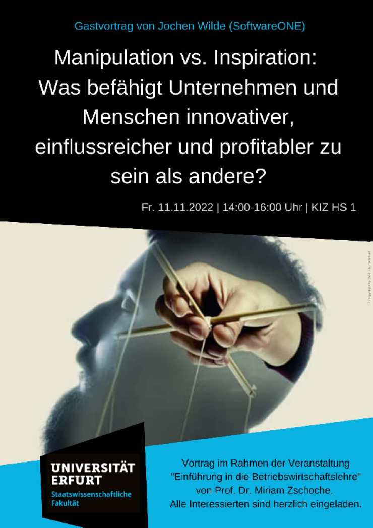 11.11.2022, Guest lecture in the context of the lectures "BWL I und II", Topic "Manipulation vs. Inspiration: What enables companies and people to be more innovative, influential and profitable than others?", Jochen Wilde (SoftwareONE)