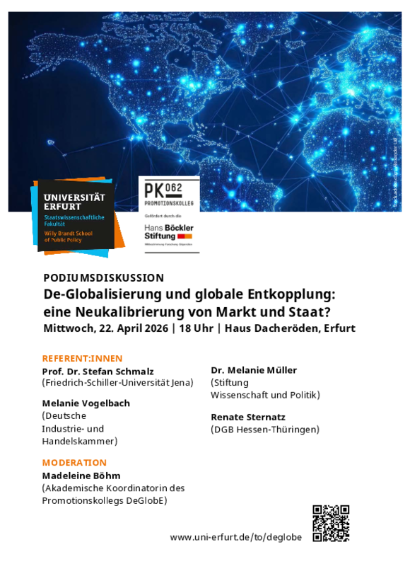 The newly founded doctoral programme "De-Globalisation and Global Decoupling" (DeGlobE) at the University of Erfurt invites you to its first public panel discussion on Wednesday, 22 April, entitled "De-Globalisation and Global Decoupling. A…
