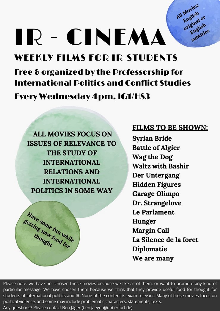 We cordially invite you to join the "IR Cinema": every Wednesday, we will show a movie that raises interesting themes concerning international politics or 'the international' in the widest sense. The idea is to complement your studies with wider narratives and to support community building.