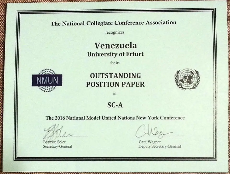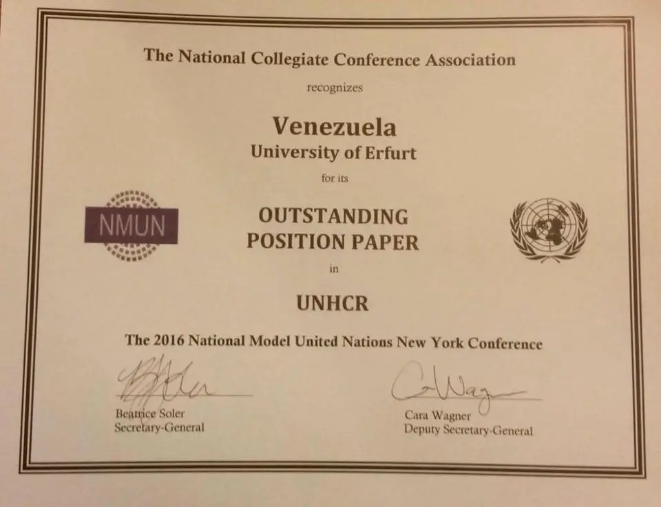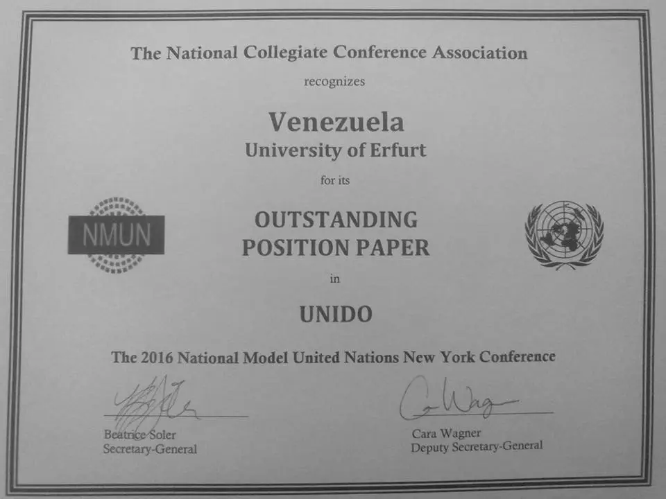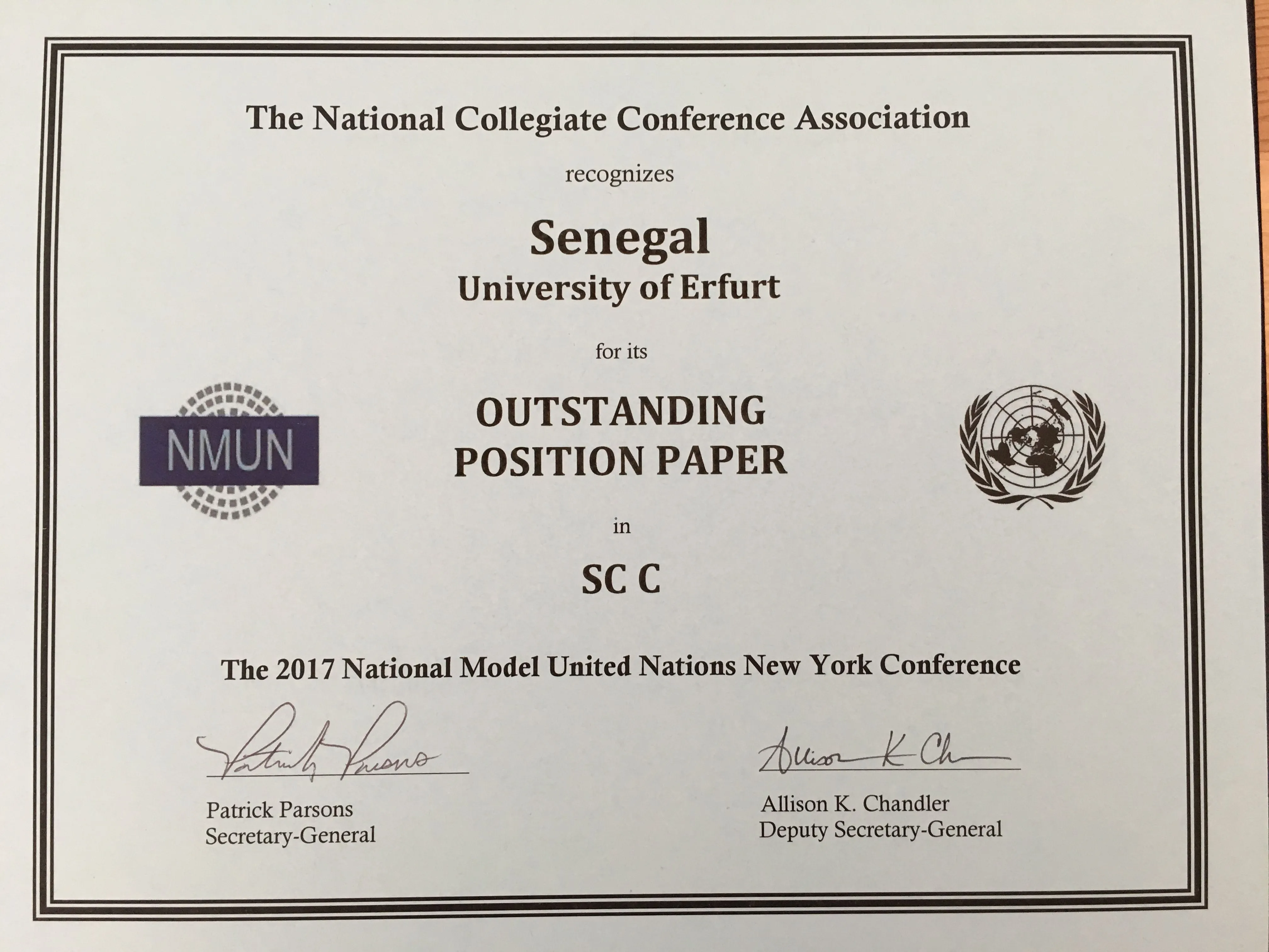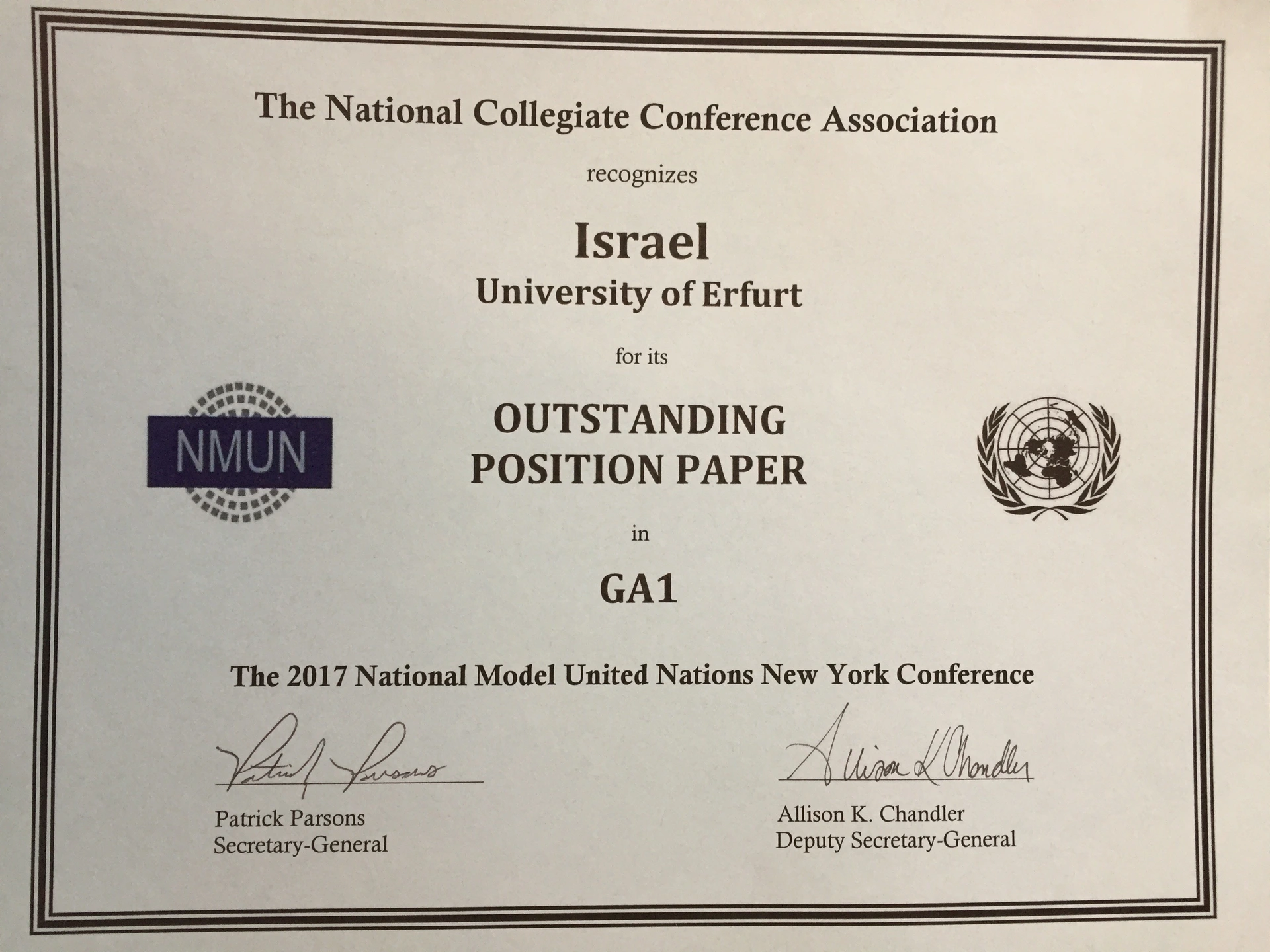 The delegation of the University of Erfurt has been very successful in recent years. Not only have the students won delegation awards at National Model United Nations conferences in the past years but furthermore, individual awards for their Position Papers or work during the conference.