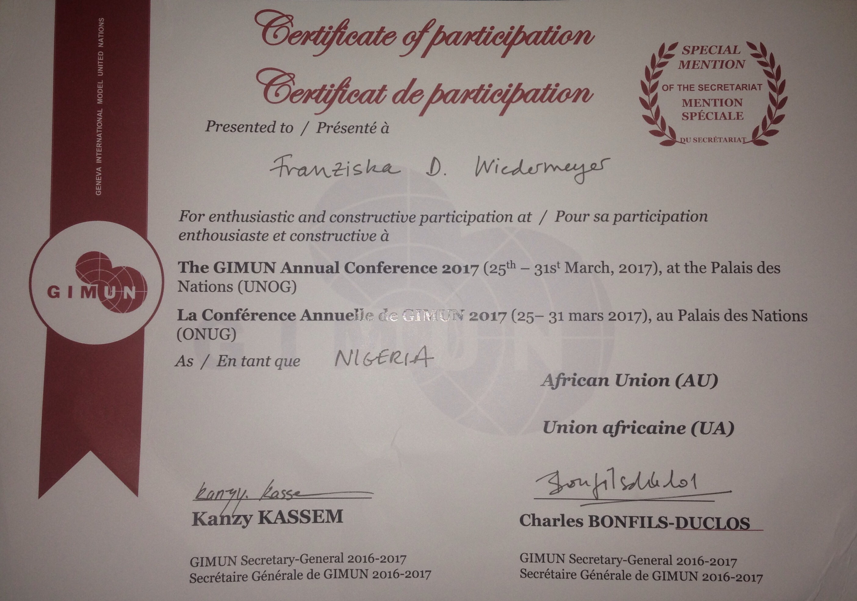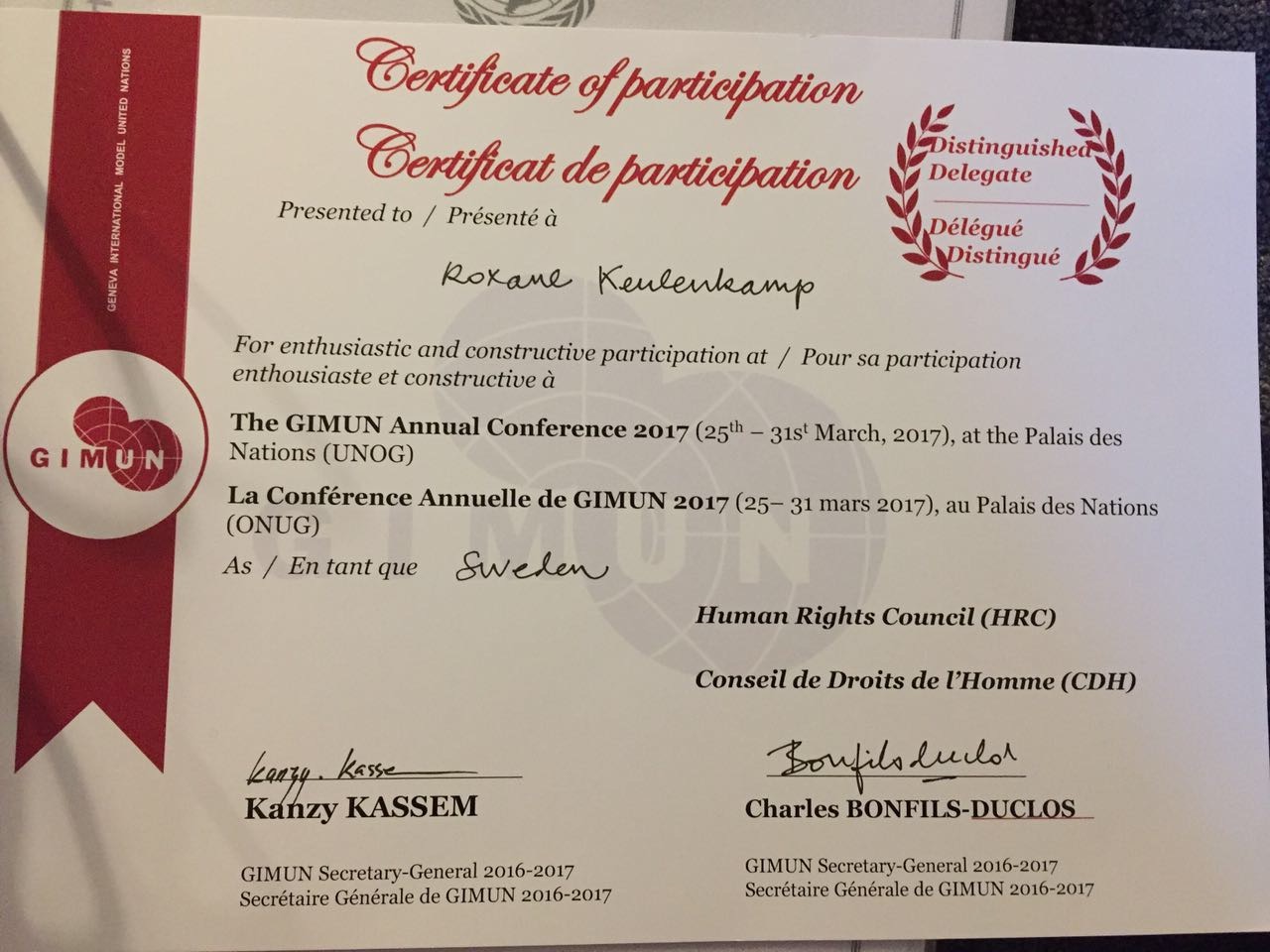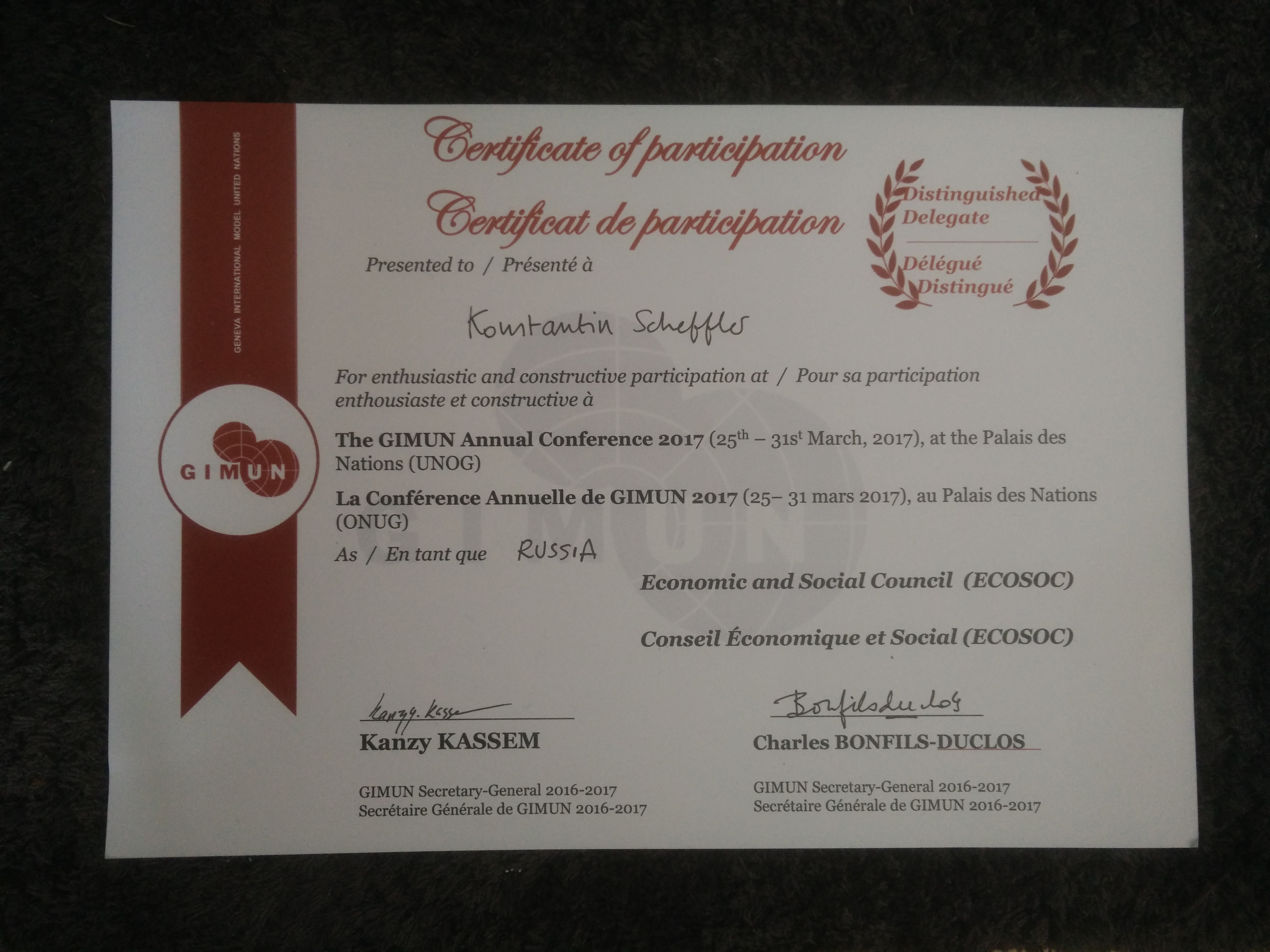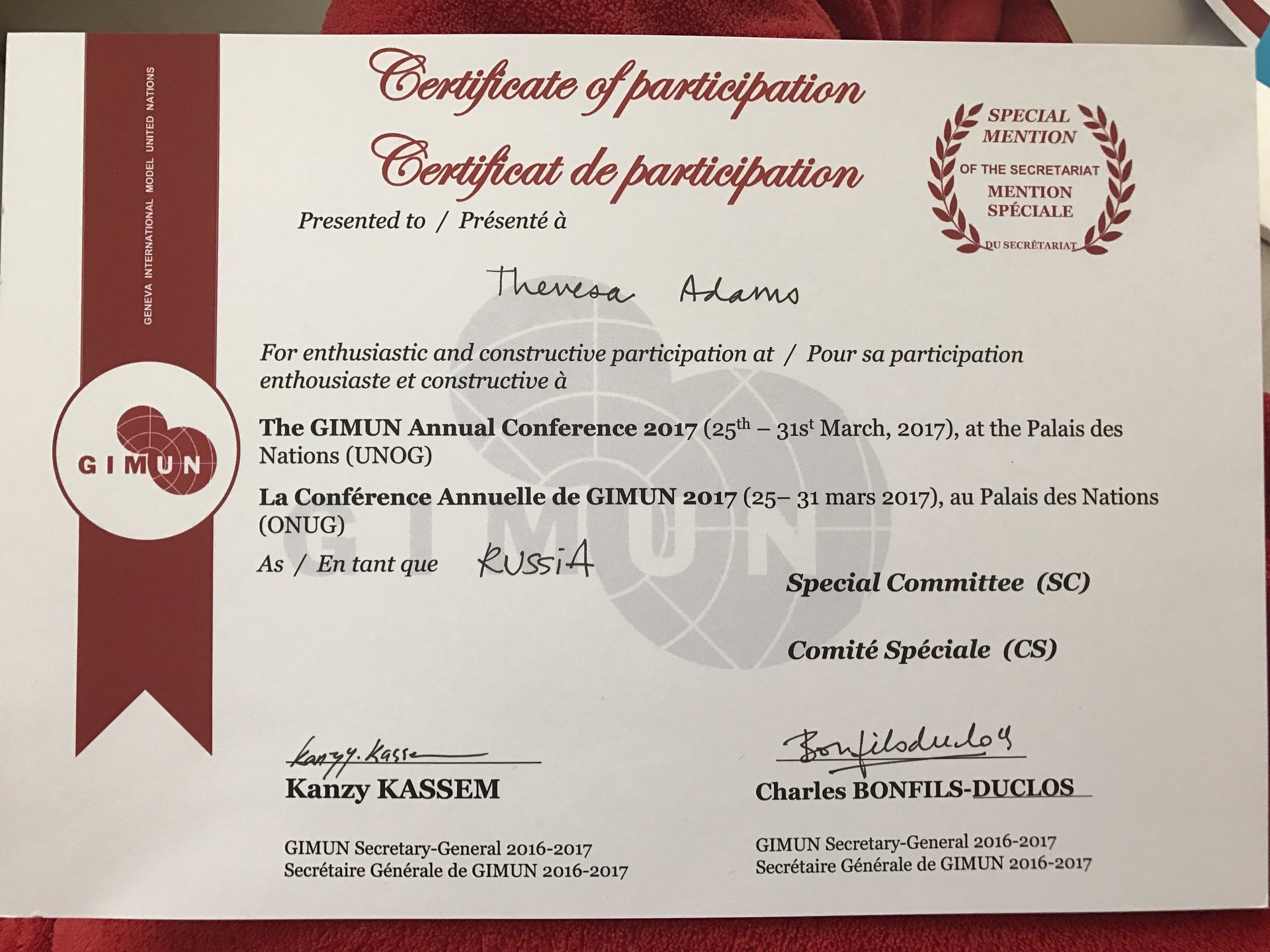 The GiMUN Geneva delegation has also been awarded several awards: 3 students received the highest honors of the conference, namely a distinguished delegate award and one student received an honorable mention award.