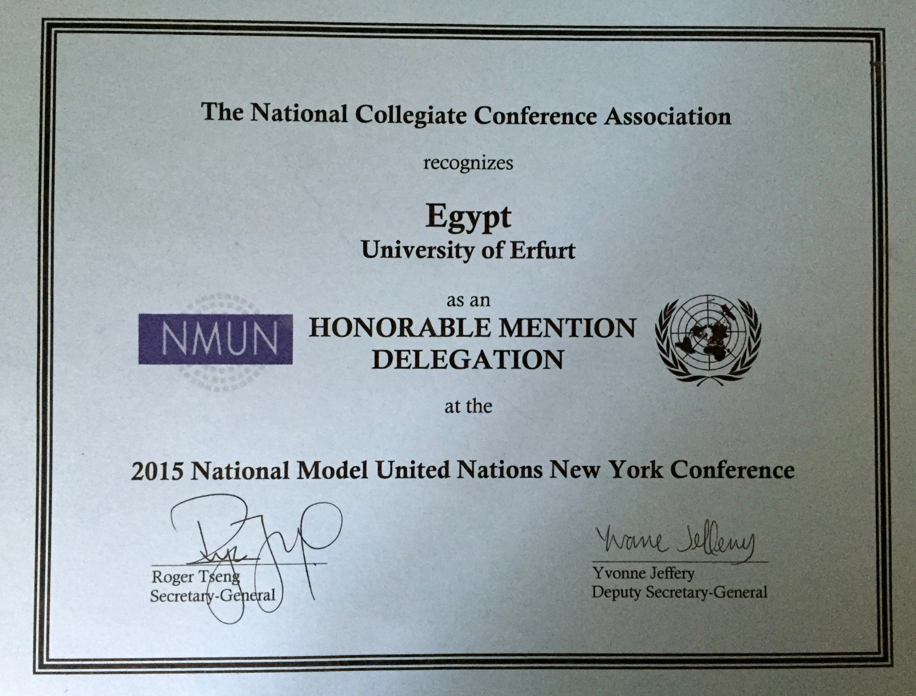The University Erfurt delegation had the honor of representing Egypt at NMUN 2015 in New York City.