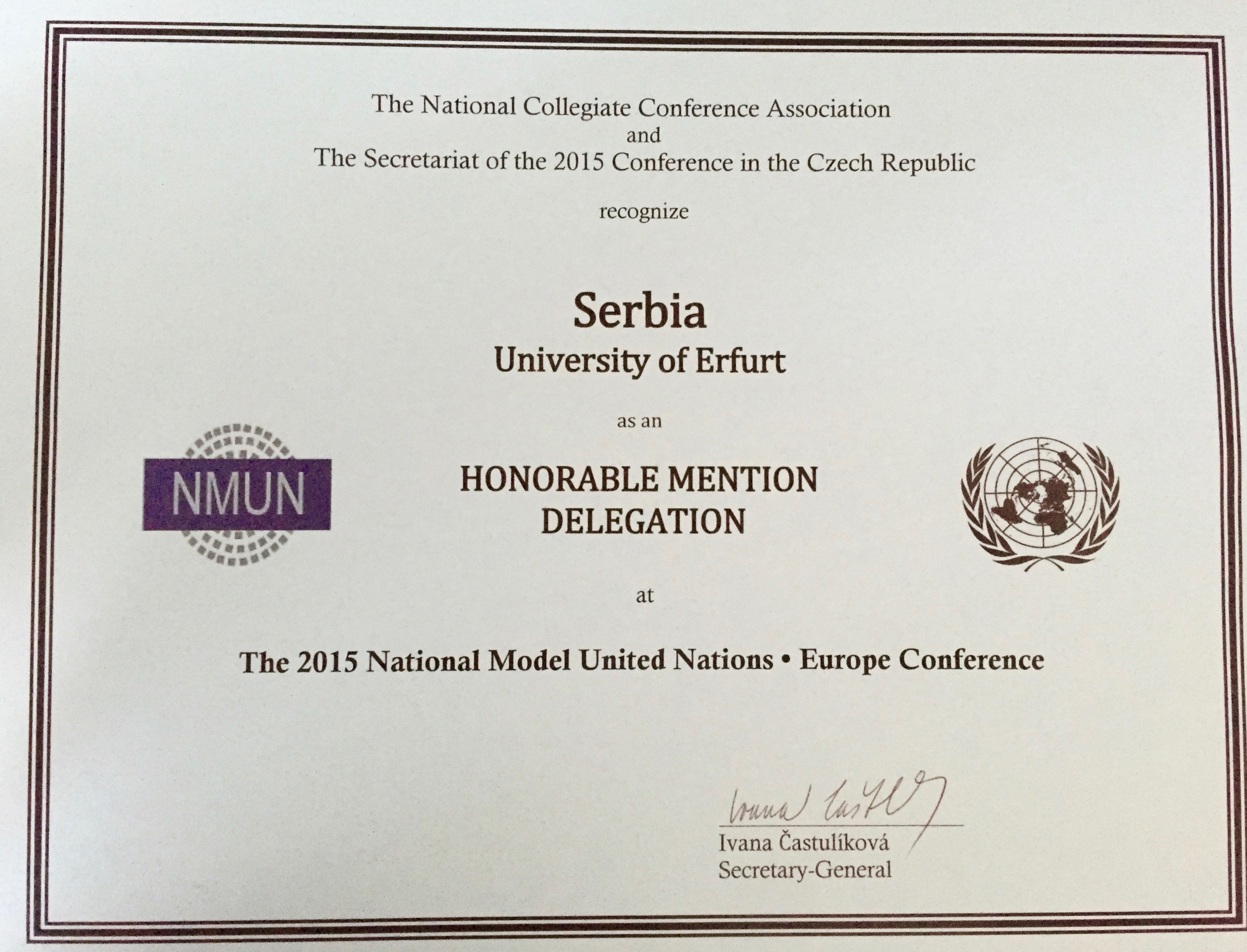 The delegates representing Serbia in the GA won an award for their Position Paper, the delegates representing Lithuania in UNESCO won an award for Best delegates. Additionally, the Universität Erfurt delegation won the award 'Honorable Mention'.