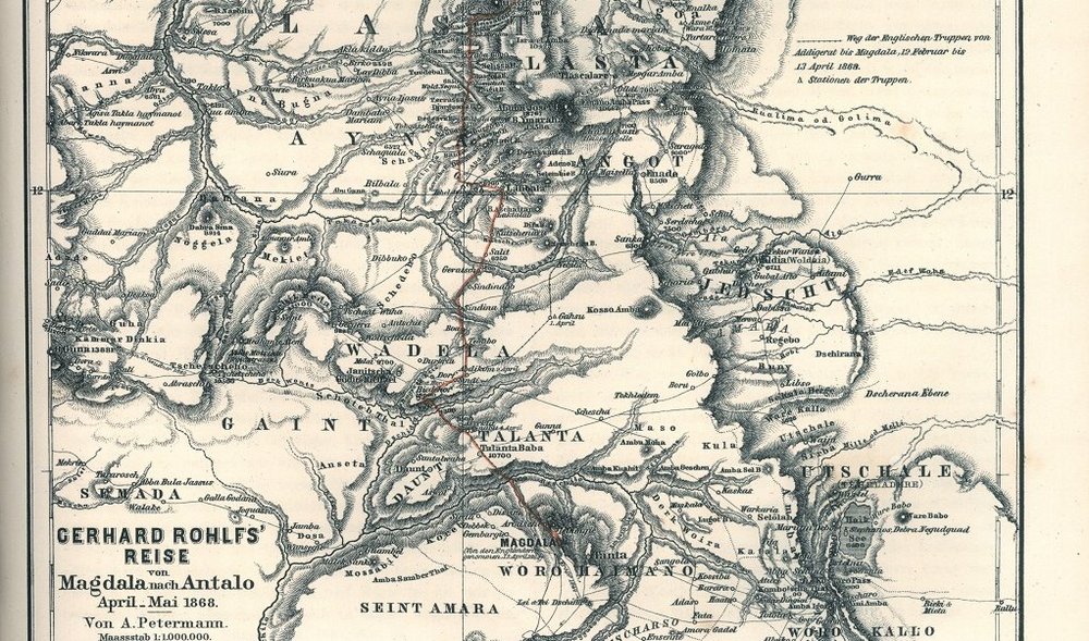 Abbildung oben: August Petermann, Gerhard Rohlfs' Reise von Magdala nach Antalo April-Mai 1868, Gotha 1868, 19 × 24 cm, Sammlung Perthes der Forschungsbibliothek Gotha, SPA 4° 00100 (014)