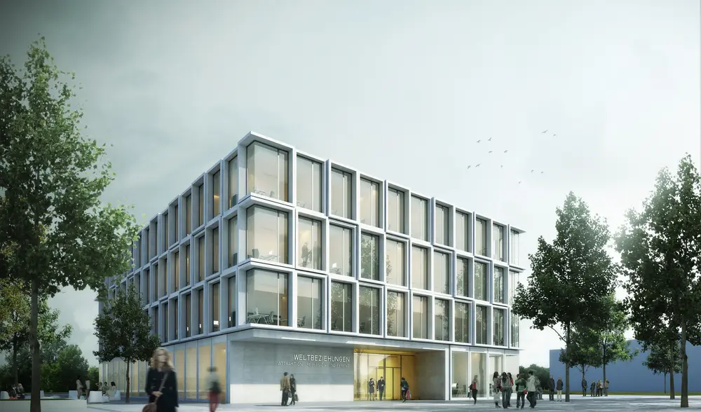 Diesen Anforderungen trägt der Planungsentwurf des Büros Obermeyer Rechnung. Das neue Gebäude soll auf 4000 Quadratmetern Raum für 160 wissenschaftliche Arbeitsplätze bieten. Den zentralen Platz bildet die Treppenhalle über sämtliche Geschosse. Eine Freitreppe mit Sitzstufen lädt zum Aufenthalt ein und ermöglicht Begegnungen. Das den Grundriss dominierende Konzept peripherer „Denkzellen“ wird auch zum gestaltprägenden Bild der Fassade. Die großformatige Verglasung der Individualräume bringt die Wissenschaftler in Sichtkontakt mit den angrenzenden öffentlichen Campusflächen.