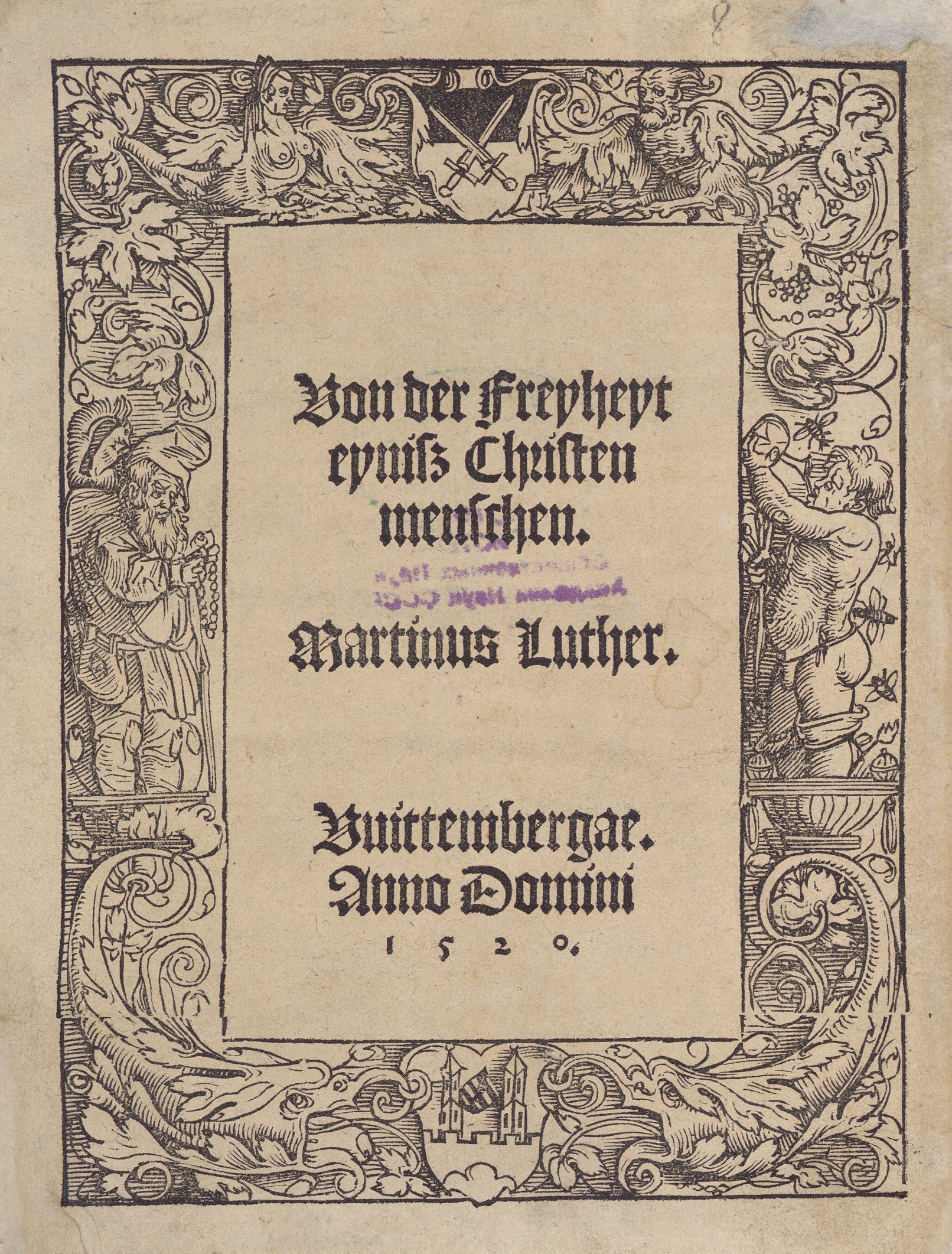 Like many of his other writings from this period, Luther's freedom pamphlet was a bestseller. After it was immediately translated into Latin, new editions appeared continuously in both languages. Since 1521, translations have been made into Czech, English, Dutch, Spanish, French and Italian. Although the number of copies is not known, thousands of copies are assumed to have been sold in Europe. The printer of the first edition was Johann Rhau-Grunenberg, who provided the woodcut of the title page with a secular decorative frame, which he also used elsewhere. The title page shows a pilgrim and a reveller, their shields held by two dolphins. Above and below are the coats of arms of the Principality of Saxony and Wittenberg.