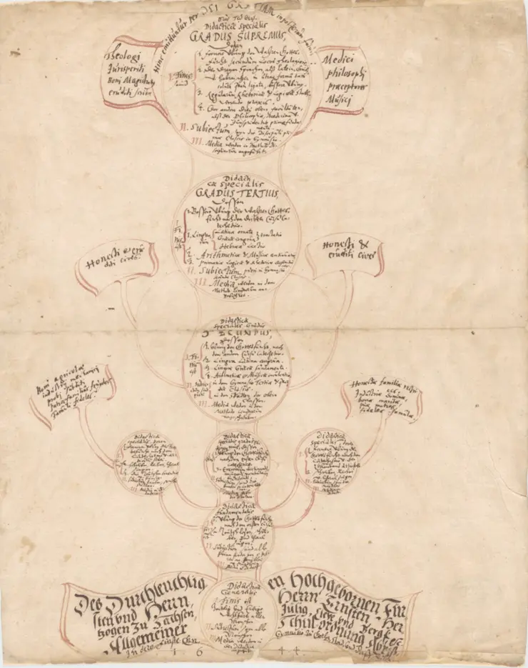 These holdings of the Gotha Research Library and the Friedenstein Foundation Gotha originated during the Thirty Years' War under Duke Ernest I who was interested in the history of education. A quarter of the early modern holdings of the Research Library is related directly or indirectly to the history of education. Of particular note are the bequests of such important educationalists as Wolfgang Ratke (1571–1635) and Andreas Reyher (1601–1673). In the collections of the Friedenstein Foundation Gotha, the objects of the princely art and naturalia chamber used for school purposes reflect the extraordinarily early promotion of natural science and other “realia”. Particularly important are the handwritten documents of the scholar Veit Ludwig von Seckendorff (1612–1692), who was in the service of the Duke between 1645 and 1664 and who played a decisive role in providing ideas and organising the Gotha reforms of state, society and education. The Gotha Research Library has been making these documents accessible since 2020 as part of a project funded by the German Research Foundation. Handwritten documents on the Gotha Gymnasium, where Seckendorff and August Hermann Francke (1663–1727) received their schooling, are also unique. In addition to curricula, teaching concepts, student registers and correspondence, these include the Gymnasium Library, which was integrated into the Research Library after the Second World War and which contains around 50,000 volumes.