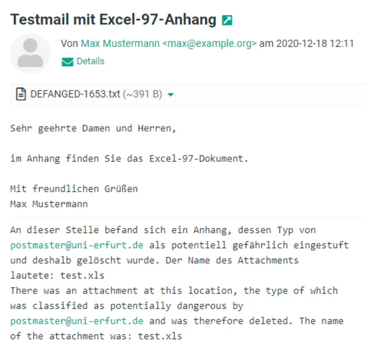 In a first step, this applies to e-mails that are sent from outside the university to e-mail addresses of the university of Erfurt. If an e-mail contains a potentially dangerous attachment, it is deleted from the e-mail and forwarded to the recipient without the corresponding attachment. The mail for the recipient then only contains the mail and a note that an attachment has been deleted and the name of the document. This applies in particular to old file formats from Microsoft Office up to Version 2003 (e.g. doc, xls, ppt ), for which it is not possible to tell whether they contain macros. The newer file formats from Office 2010 onwards (docx, xlsx, pptx), on the other hand, can still be sent by e-mail as attachments. The list of blocked file attachments will probably have to be extended. If, in exceptional cases, you want to send the old file formats in exchange with known and trustworthy partners, the URMZ recommends a cloud solution such as Gigamove from RWTH Aachen University or our DFN cloud.