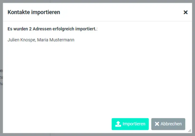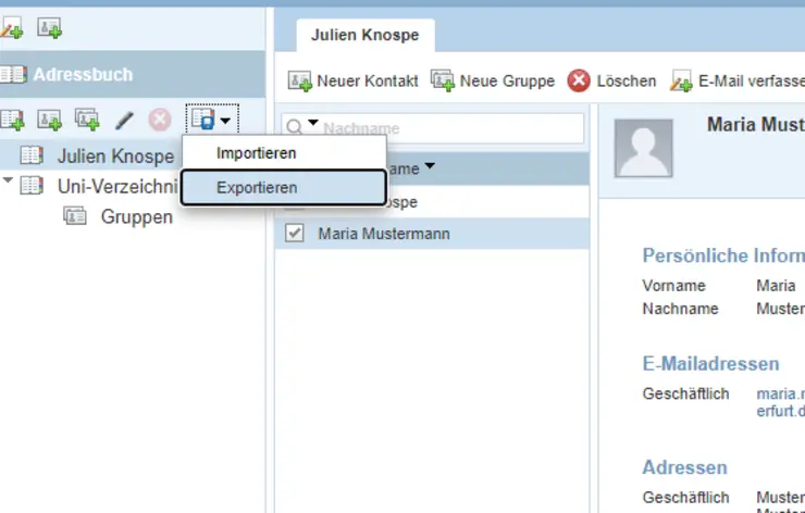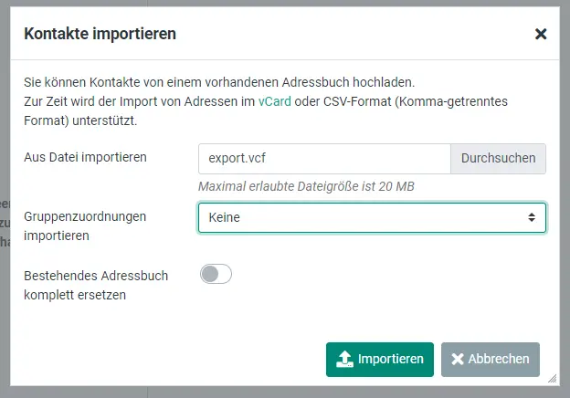 The transfer of your personal address book from the old to the new webmail is explained in this section. If you have several address books, they can be imported one by one into the new webmail. Duplicate entries are skipped in the process.