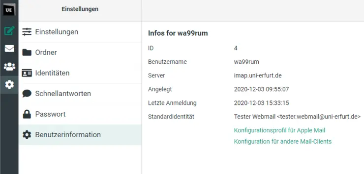 The mailbox can be set up automatically on an Apple device via a configuration profile. In webmail, after logging in, you will find a personalised download link in the User Information section to retrieve the profile. The downloaded file must then be executed on the device.