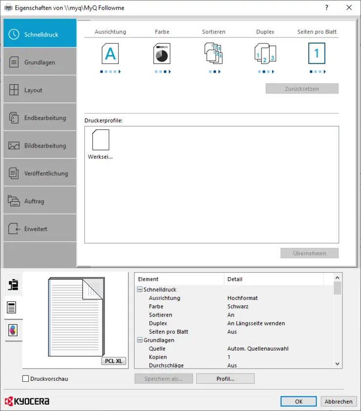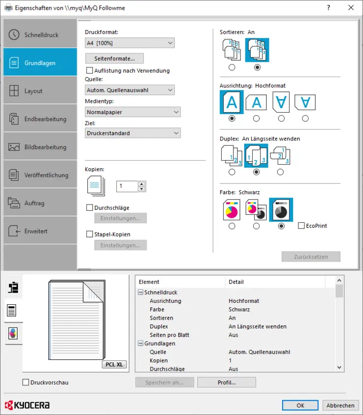 With " Quick Print" you have the possibility to change smaller settings such as orientation or pages per sheet. This is good for prints where not much needs to be changed or no subtleties need to be set.