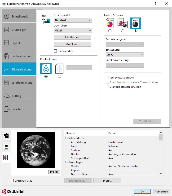After you have adjusted all the settings to your liking, click on "OK" to save them. The settings then apply to all subsequent print jobs. Please note, however, that the settings are only valid for the device where you have changed the settings. Settings you have made for MyMFP-Mono do not apply to MyMFP-Colour and must be made separately for the machine.