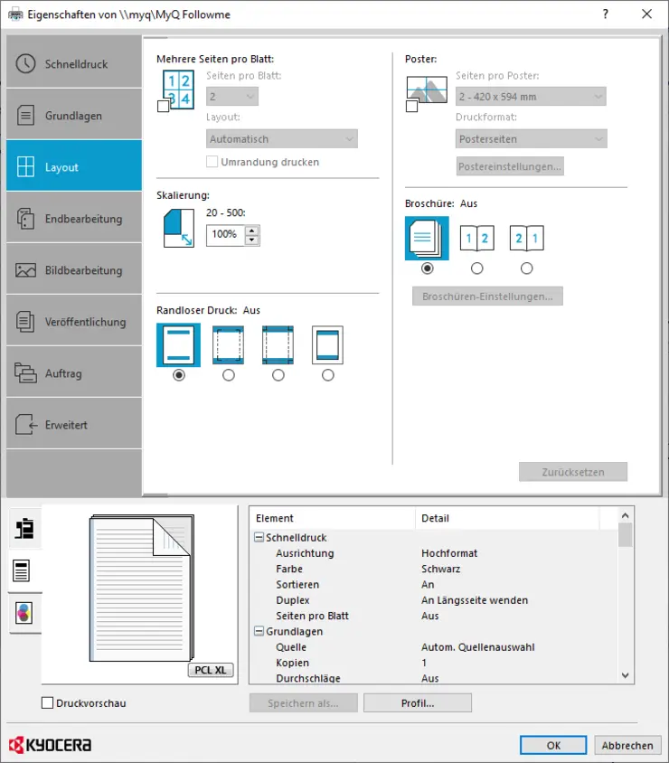 With "Layout" you can set how the document is to be printed. Select whether you want to print several pages per sheet, change the scaling according to your wishes or select borderless printing.
