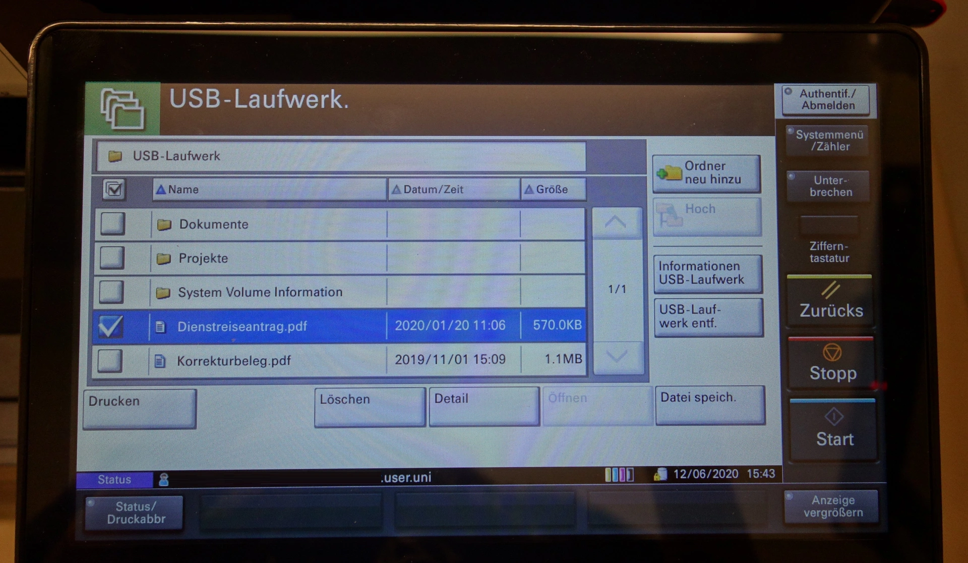 - To print, select the document on the USB stick and start the print job by pressing the "Print" key.