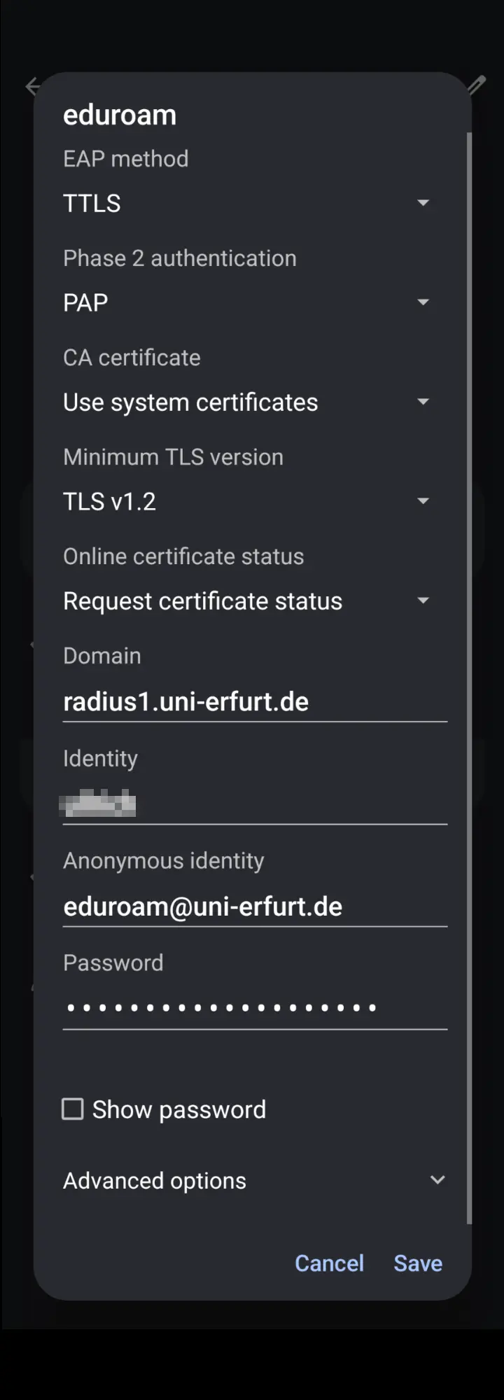 - Anonymous identity: eduroam@uni-erfurt.de