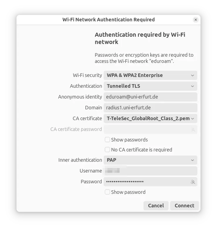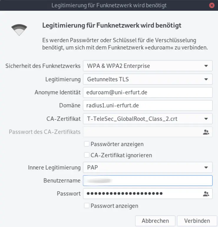 - Anonymous identity: eduroam@uni-erfurt.de