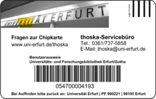 After enrolment, students will receive their student id card by mail. You have to upload a suitable photo via the University of Erfurt's applicant portal when you register online or after admission, so we can print your student id card.